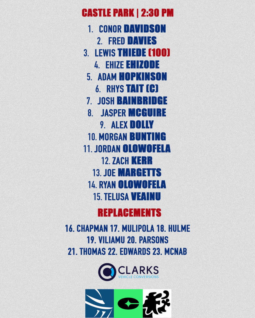 SQUAD: 1. Conor Davidson 2. Fred Davies, 3. Lewis Thiede, 4. Ehize Ehizode, 5. Adam Hopkinson, 6. Rhys Tait 7. Josh Bainbridge, 8. Jasper McGuire, 9. Alex Dolly. 10. Morgan Bunting, 11. Jordan Olowofela, 12. Zach Kerr 13. Joe Margetts, 14. Ryan Olowofela, 15. Telusa Veainu